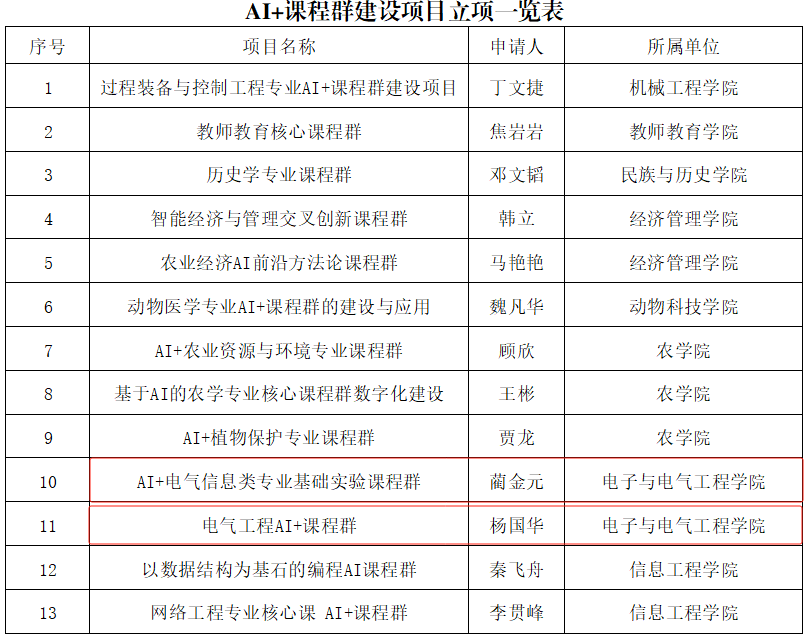 【电院讯 焦浩展/文、图】近日,学校公布2025年AI+课程群建设项目立项名单和第七批校级课程思政示范项目立项名单,全校共立项39项AI+课程群建设项目和20项课程思政示范项目,我院杨国华教师团队《电气工程AI+课程群》和蔺金元教师团队《AI+电气信息专业基础实验课程群》获AI+课程群建设项目立项,魏春英教师团队《模拟电子技术》获校级课程思政建设立项。
