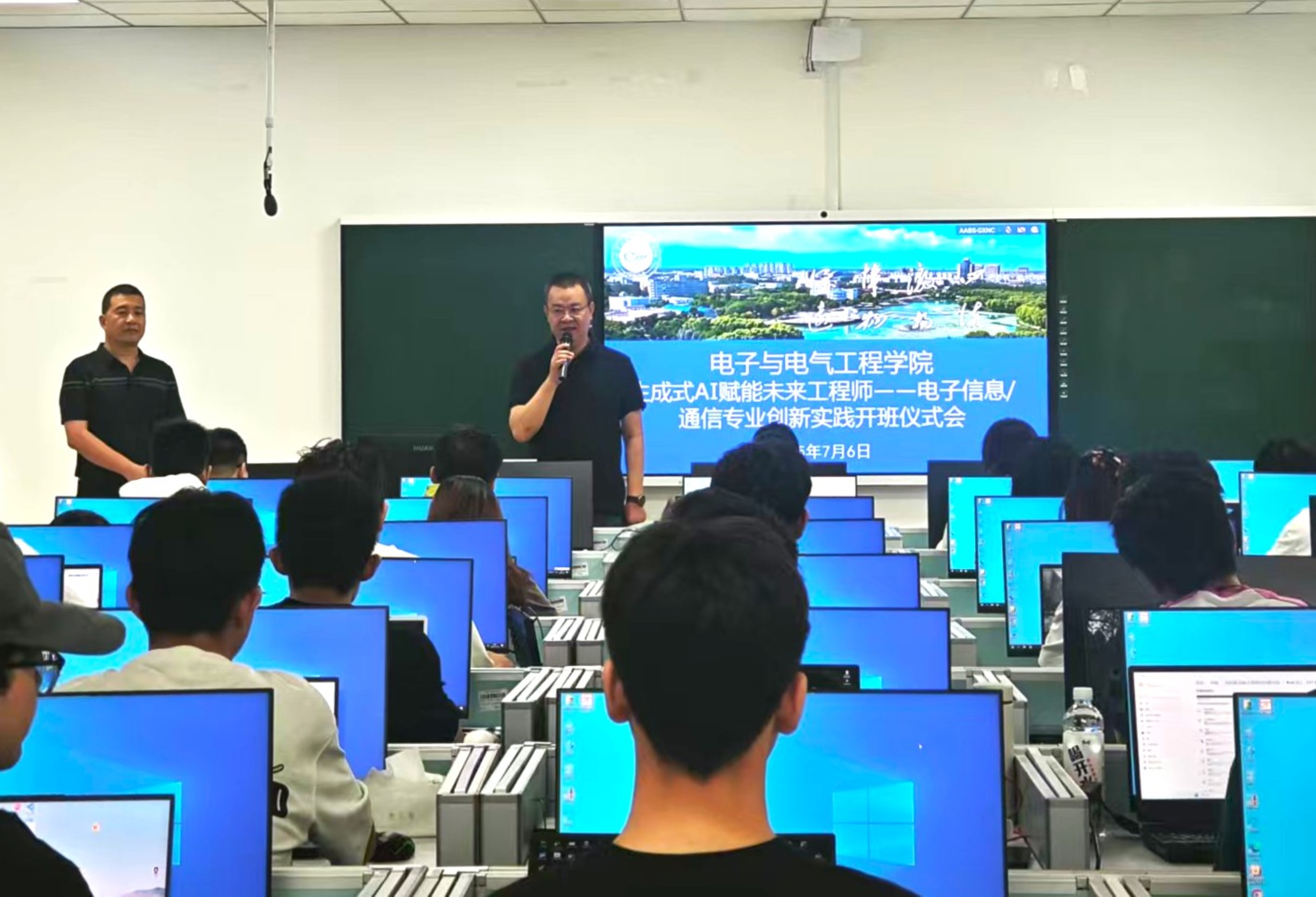 【电院讯 朱瑜红/文 覃国车/图】为深化前沿人工智能技术与专业核心能力培养的深度融合,着力培育面向未来的复合型工程人才,7月6日,我院在贺兰山校区笃行楼隆重举行“生成式AI赋能未来工程师——电子信息工程/通信工程专业创新实践”暑期课程开班式。学院领导、行业专家及2022级首批参训同学齐聚一堂,共同见证课程启动。开班仪式由学院副院长李春树主持。