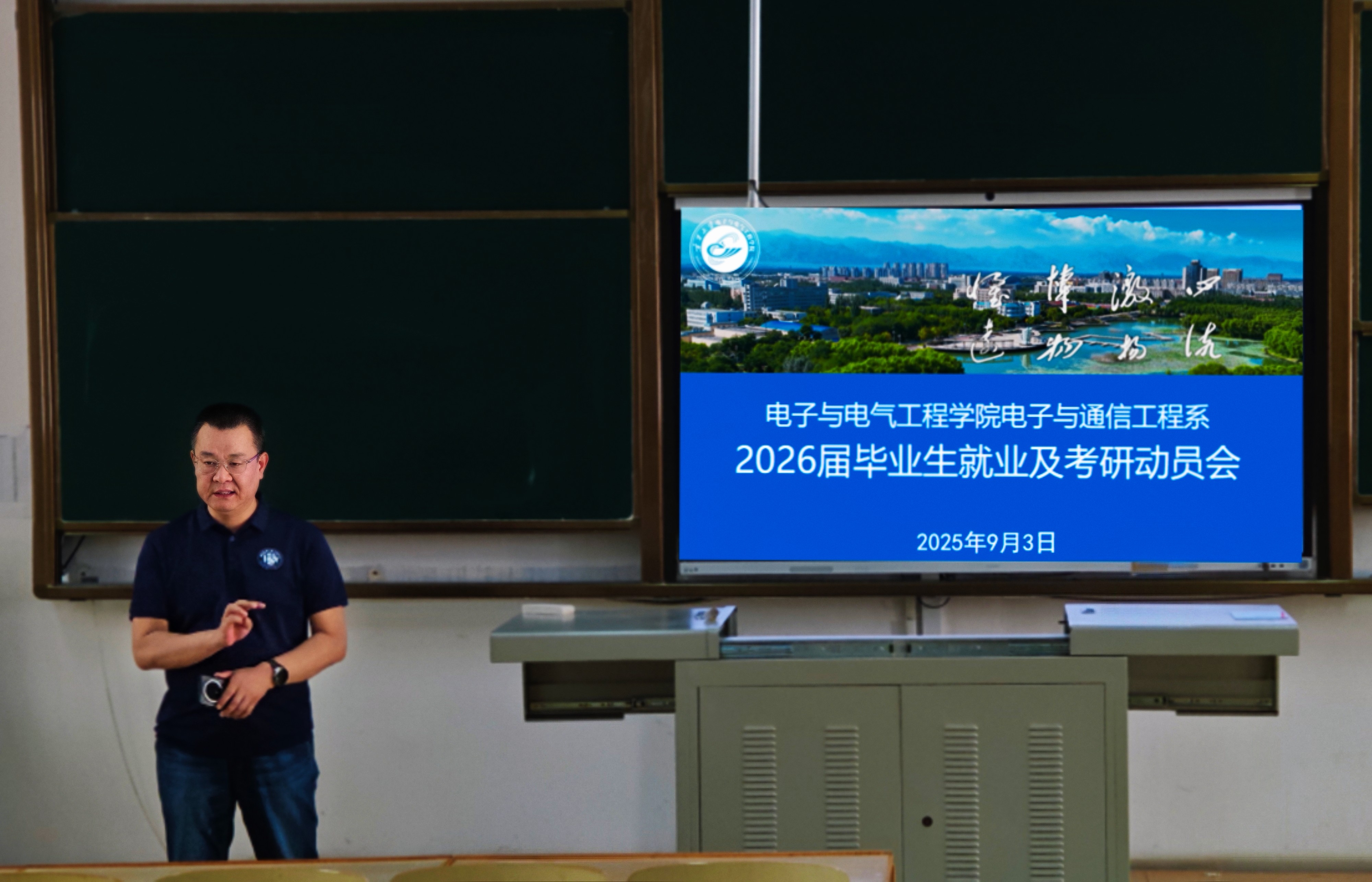 【电院讯 覃国车/文、图】为全面落实新时代高等教育育人要求,着力培养具备综合能力与创新精神的复合型人才,进一步增强学生在集成电路产业中的竞争力,9月3日,我院电子与通信工程系于怀远一教召开2026届毕业生就业与考研指导会。学院院长孙学宏、骨干教师杨向红及2026届全体毕业生参加会议,会议由系副主任覃国车主持。