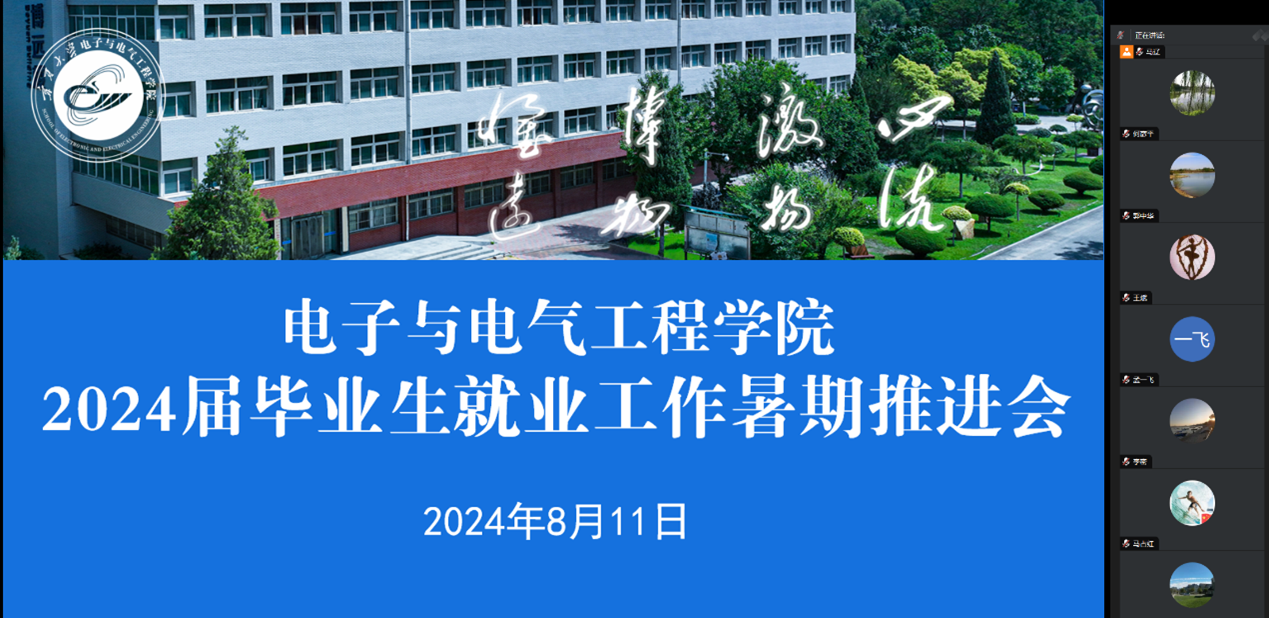【电院讯 马辽/文、图】为进一步贯彻落实学校2024届毕业生就业工作冲刺阶段调度会会议精神,确保毕业生毕业去向落实率稳步提升,高质量完成就业目标任务,8月11日,我院线上召开2024届毕业生就业工作暑期推进会,对学院毕业生就业工作进行再梳理再部署再要求。