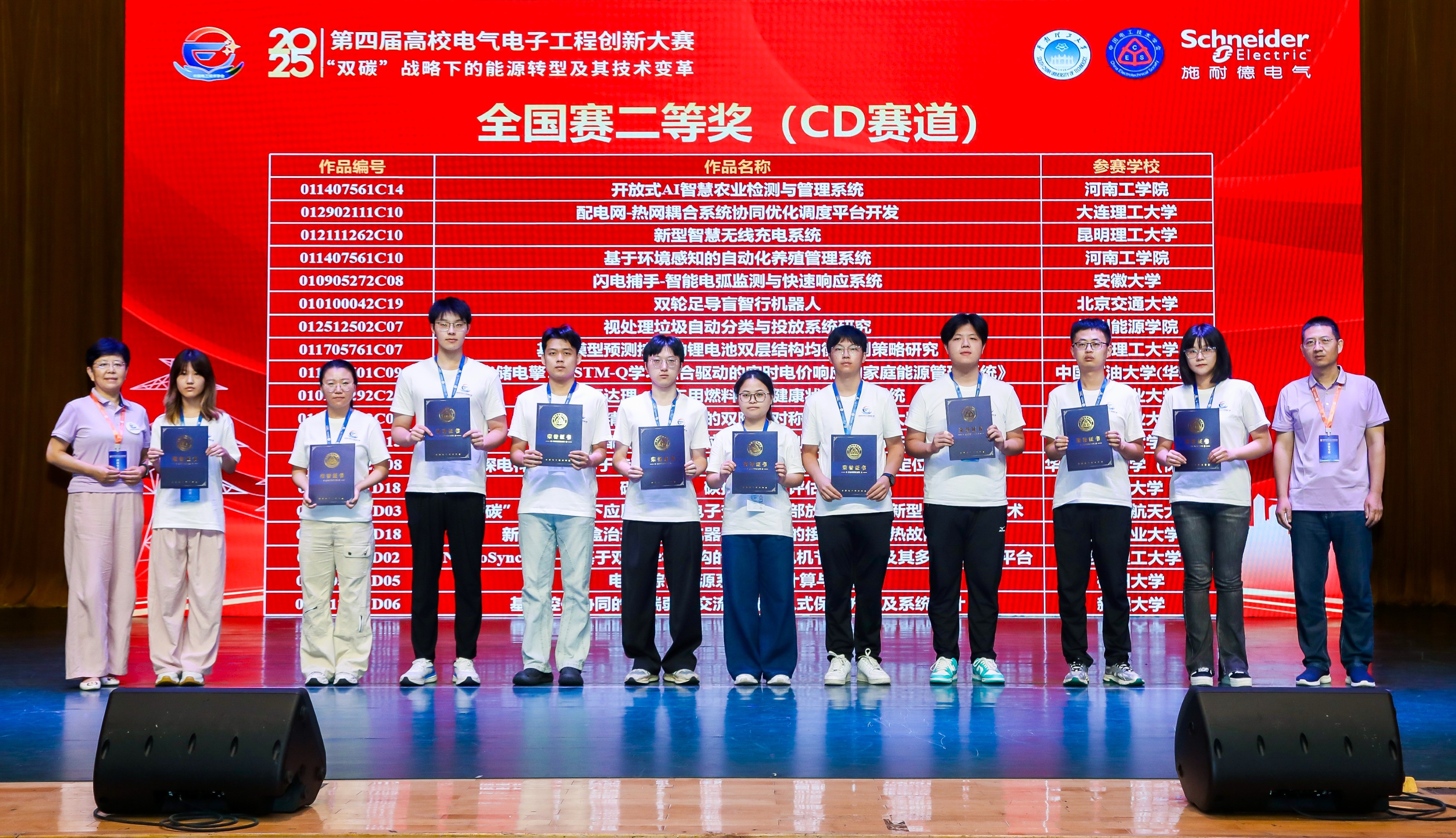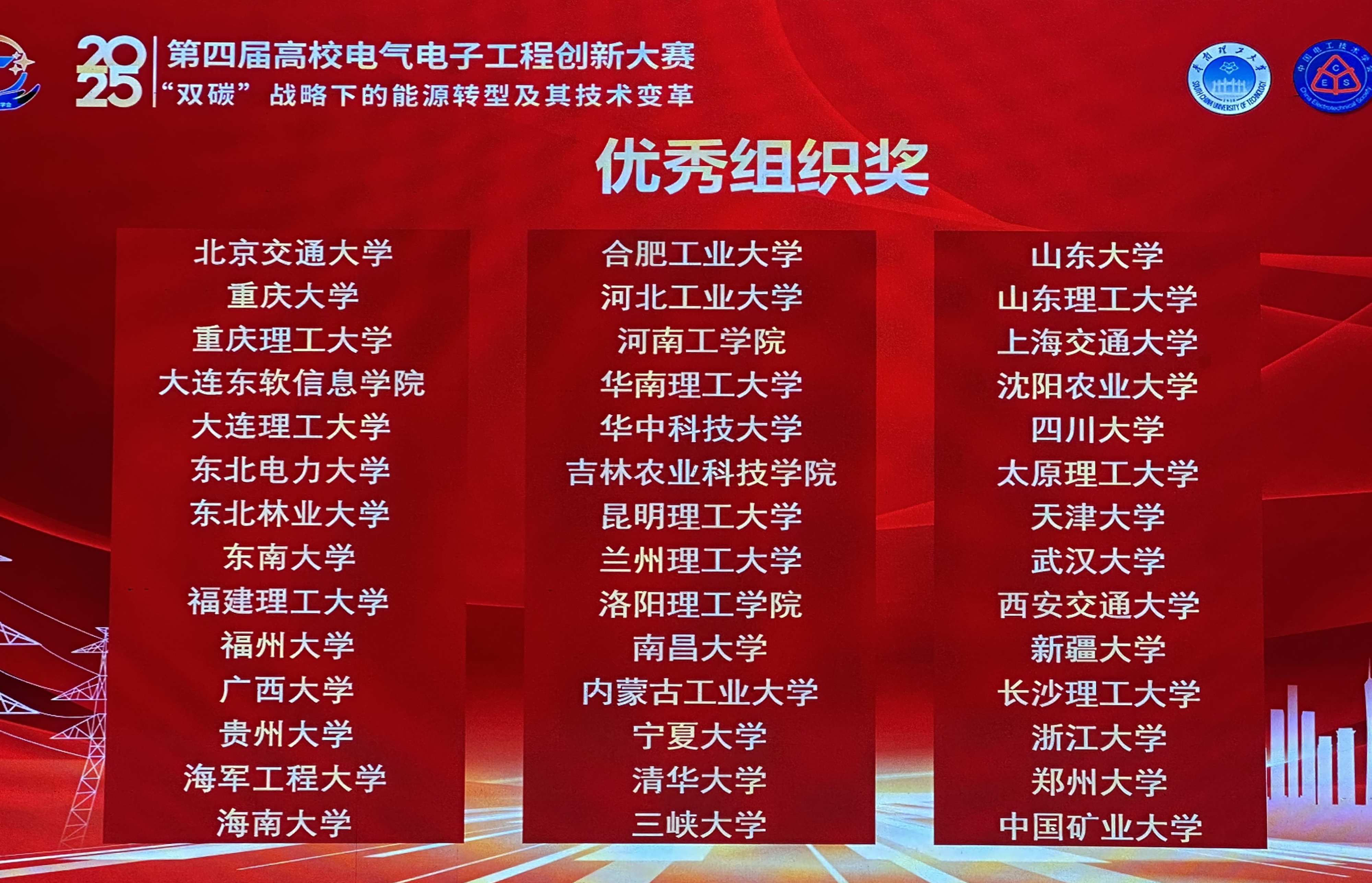 【电院讯 杨国华/文、图】8月11日,由中国电工技术学会主办、华南理工大学承办的第四届高校电气电子工程创新大赛全国总决赛在广州圆满落幕。经过激烈角逐,我院选送的三支参赛团队均荣获总决赛二等奖,杨国华、李峰、宋娟三位教师获评“优秀指导教师”,我校荣获“优秀组织奖”。