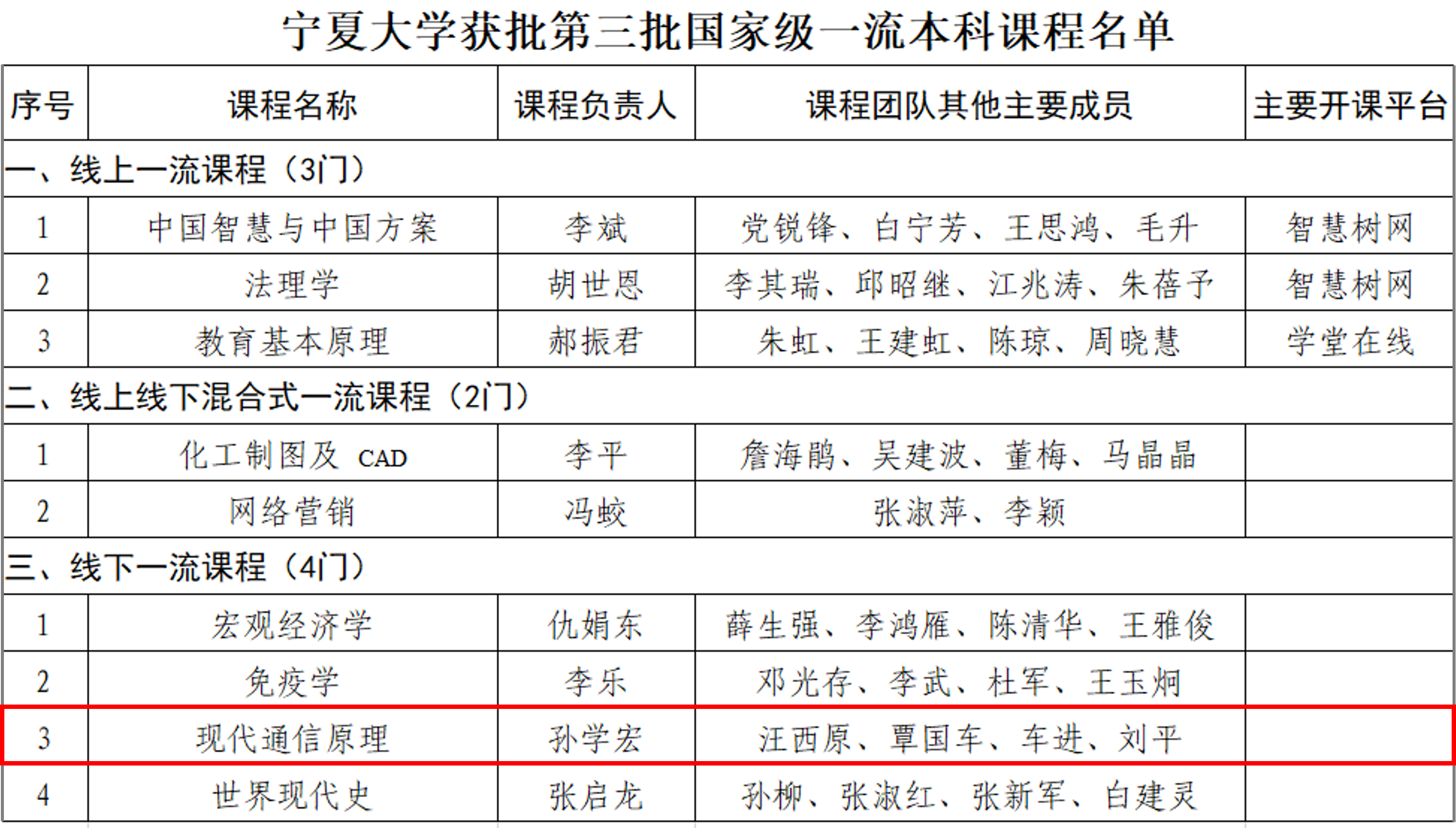 【电院讯】近日,教育部公布第三批国家级一流本科课程认定结果。williamhill共有9门课程获批国家级一流本科课程,包括线上课程3门、线下课程4门、线上线下混合式课程2门。其中,我院孙学宏教授团队主持的《现代通信原理》课程获批“线下一流课程”。