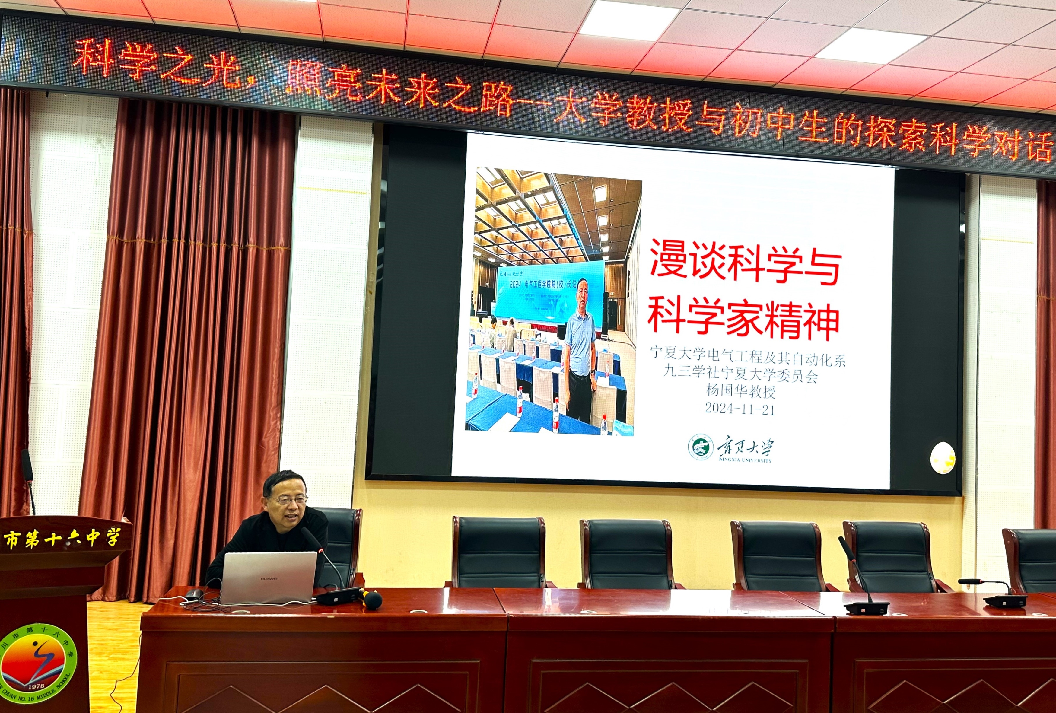 【电院讯 杨国华/文、图】近日,我院电气工程学科负责人杨国华教授受邀走进银川市第二十四中学北校区为中学生做“科学与科学家精神”科学教育专题讲座。报告会前,北校区校长何明为杨国华颁发科学副校长聘书。今...